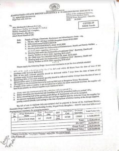 5) ಎರಡೂವರೆ ಪಟ್ಟು ಹಣಕ್ಕೆ ಸ್ಯಾನಿಟೈಜರ್ ಖರೀದಿ: 2019ರಲ್ಲಿ ಟೆಂಡರ್ ಮೂಲಕ ಎಂಎಸ್ ಫಾರ್ಮಸಿಟಿಕಲ್ ಕಂಪೆನಿಗೆ 500 ಎಂಎಲ್ಗಳ 47,000 ಯೂನಿಟ್ಗಳನ್ನು ಪ್ರತಿ ಬಾಟಲ್ಗೆ 97.44 ರೂ.ಗಳಂತೆ ಕರ್ನಾಟಕ ಡ್ರಗ್ಸ್ ಲಾಜೆಸ್ಟಿಕ್ಸ್ ಸಂಸ್ಥೆಯು ಖರೀದಿಗೆ ಆದೇಶ ನೀಡಿತ್ತು. ಬೇಡಿಕೆಯಲ್ಲಿ ಶೇ.50ರಷ್ಟು ಸ್ಯಾನಿಟೈಸರ್ ಪೂರೈಸಿದ್ದ ಚೆನ್ನೈನ ಆ ಕಂಪನಿಯು, ಬಾಕಿ ಉತ್ಪನ್ನ ಪೂರೈಕೆ ಮಾಡುವುದಿಲ್ಲ ಎಂದು ತಿಳಿಸಿತ್ತು.