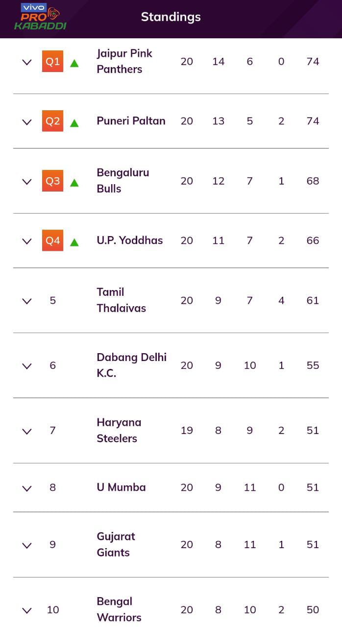 ಜೈಪುರ್ ಪಿಂಕ್ ಪ್ಯಾಂಥರ್ಸ್ ಮತ್ತು ಪುಣೇರಿ ಪಲ್ಟಾನ್ ತಂಡಗಳು ತಲಾ 20 ಪಂದ್ಯಗಳಿಂದ ತಲಾ 74 ಅಂಕ ಗಳಿಸಿ ಮೊದಲ ಮತ್ತು ಎರಡನೇ ಸ್ಥಾನದಲ್ಲಿದ್ದು ಈಗಾಗಲೆ ಪ್ಲೇ ಆಫ್ನಲ್ಲಿ ತಮ್ಮ ಸ್ಥಾನ ಖಚಿತಪಡಿಸಿಕೊಂಡಿವೆ. ಬೆಂಗಳೂರು ತಂಡ 20 ಪಂದ್ಯಗಳಿಂದ 68 ಅಂಕ ಗಳಿಸಿದರೆ, ಅಷ್ಟೇ ಪಂದ್ಯಗಳಿಂದ ಯುಪಿ ಯೋಧ ತಂಡ 66 ಅಂಕ ಗಳಿಸಿ ಅದು ಸಹ ಪ್ಲೇ ಆಫ್ನಲ್ಲಿ ಸ್ಥಾನ ಪಡೆದಿದೆ.