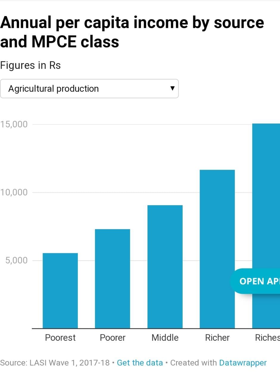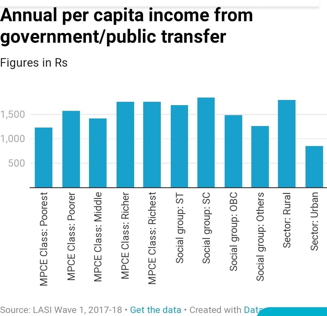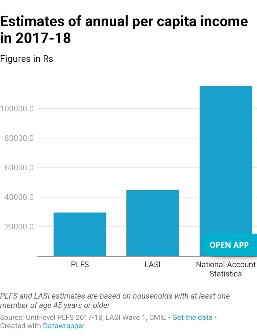 2017-18ರಲ್ಲಿ ನಡೆಸಿದ ಲಾಂಗಿಟ್ಯೂಡಿನಲ್ ಏಜಿಂಗ್ ಸ್ಟಡಿ ಇನ್ ಇಂಡಿಯಾ (ಎಲ್ಎಸಿಐ) ಸಮೀಕ್ಷೆಯಲ್ಲಿ ಸಂದರ್ಶನ ಮಾಡಿದ ಕುಟುಂಬಗಳ ಸರಾಸರಿ ವಾರ್ಷಿಕ ತಲಾ ಆದಾಯ ರೂ. 44,901. ನ್ಯಾಷನಲ್ ಅಕೌಂಟ್ ಸ್ಟೆಟಿಕ್ಸ್ ಸಿದ್ಧಾಂತದ ಪ್ರಕಾರ ಅದೇ ವರ್ಷದಲ್ಲಿ ಇದು ತಲಾ ಆದಾಯದ ಕೇವಲ 39% ಆಗಿದೆ ಎಂದು ಹಿಂದೂಸ್ತಾನ್ ಟೈಮ್ಸ್ ವರದಿ ಮಾಡಿದೆ.