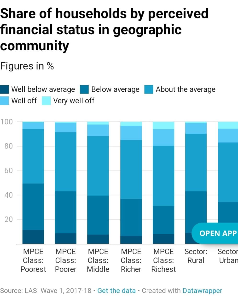 ಅಂತಹ ಕಡಿಮೆ ಆದಾಯದ ಮಟ್ಟದಲ್ಲಿಯೂ ಸಹ, ಅರ್ಧದಷ್ಟು ಭಾರತೀಯರು ತಮ್ಮನ್ನು ತಮ್ಮ ಗೆಳೆಯರೊಂದಿಗೆ ಸಮಾನರು ಎಂದು ಭಾವಿಸುತ್ತಾರೆ. ಇನ್ನೂ ಆಶ್ಚರ್ಯಕರ ಸಂಗತಿಯೆಂದರೆ, ಈ ಭಾವನೆಯು ಒಬ್ಬ ಬಡ ಅಥವಾ ಶ್ರೀಮಂತ ಮನೆಗಳನ್ನು ನೋಡುತ್ತದೆಯೆ ಎಂಬುದು ಅಷ್ಟೇನೂ ಬದಲಾಗುವುದಿಲ್ಲ. ಖಚಿತವಾಗಿ ಹೇಳುವುದಾದರೆ, ಈ ಅಂಕಿಅಂಶಗಳು ಭಾರತದಲ್ಲಿ ಭದ್ರವಾಗಿರುವ ಆರ್ಥಿಕ ಘೆಟ್ಟೊಯೈಸೇಶನ್ನ (ಅಸಹಾಯಕರ ಫಲವನ್ನು ನುಂಗುವ ಸಣ್ಣ ಸಂಖ್ಯೆಯ ಸ್ಥಿತಿವಂತರ ವಿದ್ಯಮಾನ) ಪ್ರತಿಬಿಂಬವಾಗಬಹುದು.