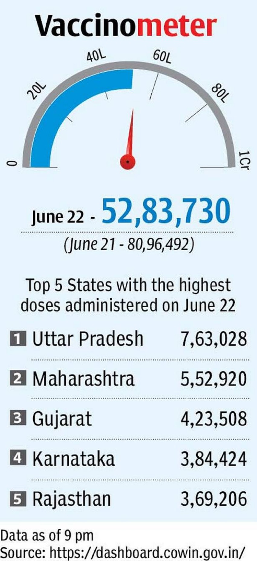 ಜೂನ್ 21 ರ ಸೋಮವಾರ ದೇಶದಲ್ಲಿ ಅತಿಹೆಚ್ಚು ಎಂದರೆ 17 ಲಕ್ಷ ವ್ಯಾಕ್ಸಿನ್‌ಗಳನ್ನು ನೀಡಿದ್ದ ಮಧ್ಯಪ್ರದೇಶದಲ್ಲಿ ಮಂಗಳವಾರ ಕೇವಲ 4,563 ಗಳಷ್ಟು ವ್ಯಾಕ್ಸಿನ್‌ ಡೋಸ್‌ಗಳನ್ನು ಮಾತ್ರ ನೀಡಲಾಗಿದೆ.