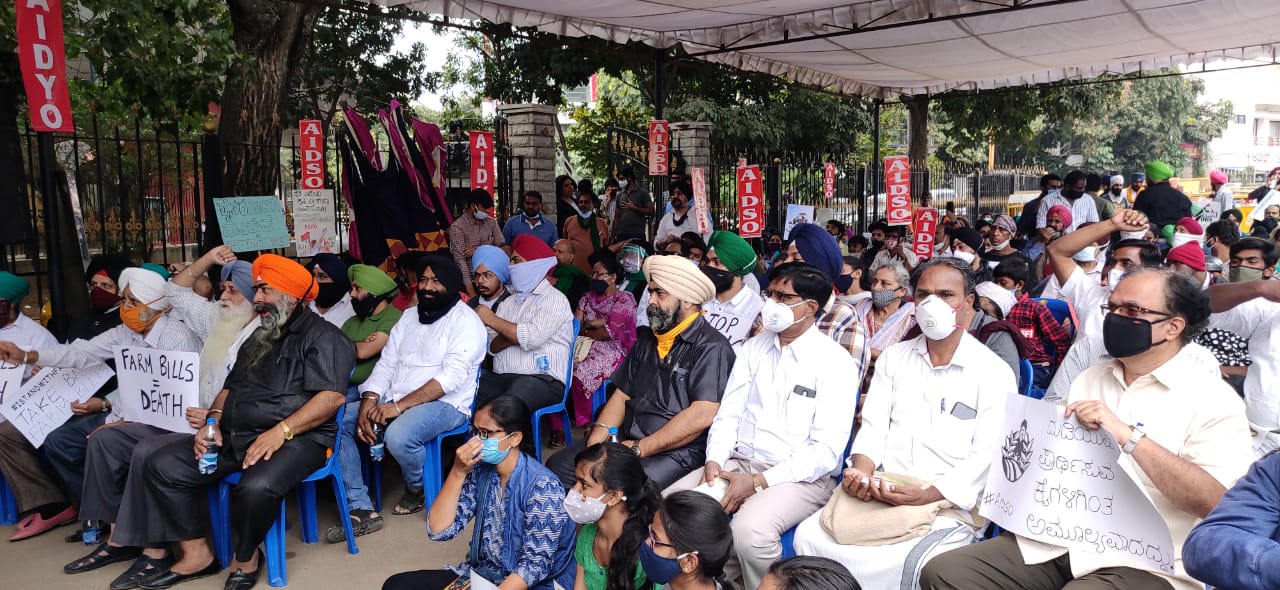 ವಿವಾದಾತ್ಮಕ ಕೃಷಿ ಕಾಯ್ದೆಗಳನ್ನು ಹಿಂಪಡೆಯುವಂತೆ ಒತ್ತಾಯಿಸಿ ದೆಹಲಿಯ ಗಡಿಗಳಲ್ಲಿ ರೈತರು ನಡೆಸುತ್ತಿರುವ ಹೋರಾಟ ಬೆಂಬಲಿಸಿ ಇಂದು ಬೆಂಗಳೂರಿನಲ್ಲಿ ವಿದ್ಯಾರ್ಥಿ ಯುವಜನರು ‘ದೇಶಪ್ರೇಮಿ ಯುವಾಂದೋಲನ’ ಹೆಸರಿನಲ್ಲಿ ಪ್ರತಿಭಟನಾ ಧರಣಿ ನಡೆಸಿದರು.