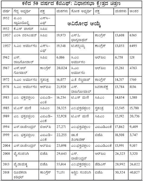ಕೆಜಿಎಫ್ ಎಂಬುದು ಕರ್ನಾಟಕದಲ್ಲಿರುವ, ಹೆಚ್ಚು ತೆಲುಗು ಭಾಷಿಕ ಹಳ್ಳಿಗಳಿಂದ ಆವೃತವಾದ ತಮಿಳು ಪಟ್ಟಣವಾಗಿದೆ. ತಮಿಳುನಾಡು ಮತ್ತು ಆಂಧ್ರ ಪ್ರದೇಶದ ಗಡಿಗೆ ಹೊಂದಿಕೊಂಡಿರುವ ಕೆಜಿಎಫ್ನಲ್ಲಿ ಕನ್ನಡ, ತೆಲುಗು ಭಾಷಿಕರಿದ್ದರೂ ಇಲ್ಲಿ ತಮಿಳು ಭಾಷೆಯ ಪ್ರಭಾವ ಹೆಚ್ಚು. ಹಾಗಾಗಿಯೇ ಎಐಎಡಿಎಂಕೆ ಪಕ್ಷ ಇಲ್ಲಿ ಮೂರು ಬಾರಿ ಜಯ ಕಂಡಿದೆ. ಕೆಜಿಎಫ್ನಲ್ಲಿ ಹೆಚ್ಚಿನ ಸಂಖ್ಯೆಯಲ್ಲಿ ದಲಿತರು ಮತ್ತು ಶ್ರಮಿಕರಿದ್ದಾರೆ. ಅವರನ್ನು ಸಂಘಟಿಸಿದ ಆರ್ಪಿಐ, ಸಿಪಿಐ, ಸಿಪಿಎಂನಂತಹ ಪರ್ಯಾಯ ರಾಜಕೀಯ ಪಕ್ಷಗಳು ಜಯಕಂಡಿವೆ.
