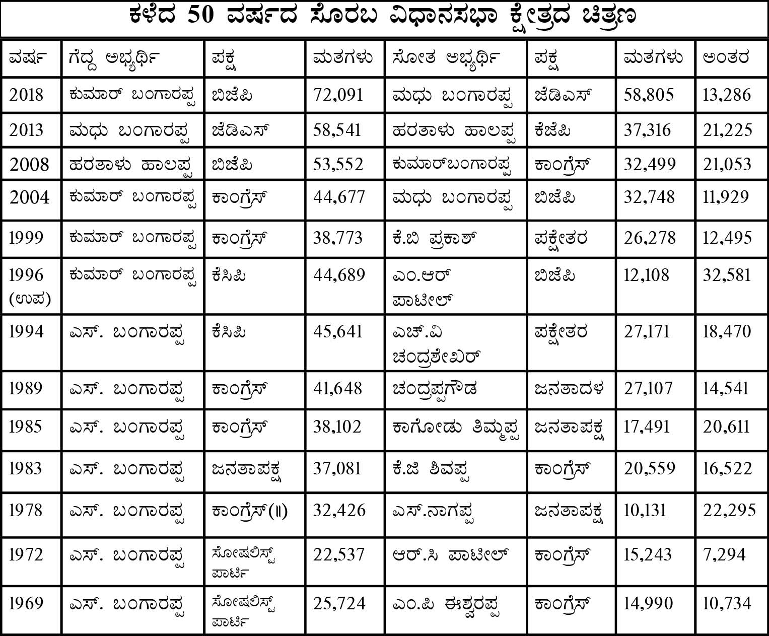 ಮಾಜಿ ಮುಖ್ಯಮಂತ್ರಿ ಸಾರೆಕೊಪ್ಪ ಬಂಗಾರಪ್ಪ ಮತ್ತವರ ಪುತ್ರದ್ವಯರ ಆಡೊಂಬಲವೆಂದು ರಾಜಕೀಯ ವಲಯದಲ್ಲಿ ಪರಿಗಣಿಸಲ್ಪಟ್ಟಿರುವ ಸೊರಬ ದೀವರ ಮತ್ತು ಲಿಂಗಾಯತರ ಜಿದ್ದಾಜಿದ್ದಿನ ಆಖಾಡ! 1967ರಲ್ಲಿ ಸೊರಬ ವಿಧಾನಸಭಾ ಕ್ಷೇತ್ರ ರಚನೆಯಾದ ಬಳಿಕ 12 ಸಾರ್ವತ್ರಿಕ ಮತ್ತು ಒಂದು ಉಪ ಚುನಾವಣೆ ನಡೆದಿದೆ. ಇದರಲ್ಲಿ ಬಂಗಾರಪ್ಪ ಸತತ 7 ಬಾರಿ ನಿರಾಯಾಸವಾಗಿ ಗೆದ್ದು ಮೂರು ದಶಕ ವಿವಿಧ ಆಯಕಟ್ಟಿನ ಅಧಿಕಾರ ಸ್ಥಾನದಲ್ಲಿದ್ದರು. 1996ರಲ್ಲಿ ಬಂಗಾರಪ್ಪ ಎಮ್ಮೆಲ್ಲೆ ಸ್ಥಾನವನ್ನು ಹಿರಿಯ ಮಗ ಕುಮಾರ್ ಬಂಗಾರಪ್ಪನವರಿಗೆ ಬಿಟ್ಟುಕೊಟ್ಟರು. ಕುಮಾರ್ ಒಂದು ಉಪ ಚುನಾವಣೆ ಮತ್ತು 3 ಸಾರ್ವತ್ರಿಕ ಚುನಾವಣೆಯಲ್ಲಿ ಶಾಸಕರಾಗಿದ್ದಾರೆ; ಬಂಗಾರಪ್ಪನವರ ಎರಡನೆ ಮಗ ಮಧು ಬಂಗಾರಪ್ಪ ಒಮ್ಮೆ ಜಯಶಾಲಿಯಾದರೆ, ಇನ್ನೊಮ್ಮೆ ಬಂಗಾರಪ್ಪನವರೆ ರಾಜಕೀಯ ದೀಕ್ಷೆ ಕೊಟ್ಟಿದ್ದ ಅವರ ಹೆಂಡತಿ ಕಡೆಯ ಸಂಬಂಧಿ ಹರತಾಳು ಹಾಲಪ್ಪ ಸೊರಬದಲ್ಲಿ ಗೆಲುವು ಕಂಡಿದ್ದಾರೆ. ಅಂದರೆ ಅಲ್ಲಿಂದಿಲ್ಲಿಗೂ ಸೊರಬ ಕ್ಷೇತ್ರ ಬಂಗಾರಪ್ಪರ ಪರಿವಾರದ ಹಿಡಿತದಲ್ಲೇ ಇದೆ.