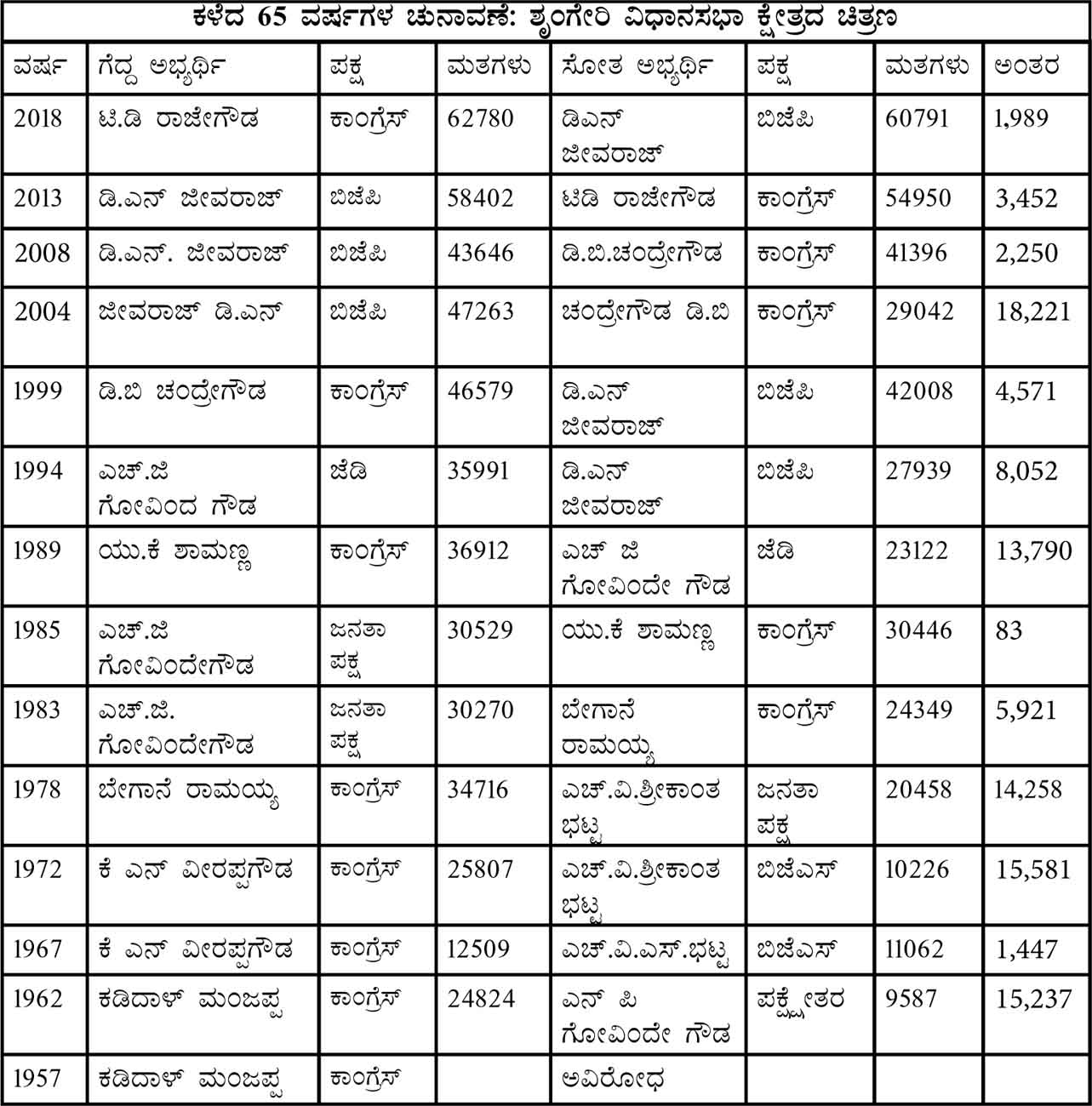 ಶೃಂಗೇರಿ ದಾಸ ಒಕ್ಕಲಿಗೆ ’ಮೀಸಲು’ ಕ್ಷೇತ್ರ ಎನ್ನಬಹುದು. ಒಕ್ಕಲಿಗೇತರರು ಯಾರೂ ಇಲ್ಲಿಂದ ಗೆದ್ದಿಲ್ಲ. ಗೇಣಿದಾರ ರೈತರ ಹಿತರಕ್ಷಣೆಯ ರಾಜಕಾರಣ ಮಾಡಿದ್ದ ಗಾಂಧಿವಾದಿ-ಸಮಾಜವಾದಿ-ಮಾಜಿ ಮುಖ್ಯಮಂತ್ರಿ ಕಡಿದಾಳು ಮಂಜಪ್ಪ ಮತ್ತು ’ಮಲೆನಾಡ ಗಾಂಧಿ’ ಎಂದೇ ಖ್ಯಾತರಾಗಿದ್ದ ಸ್ವಾತಂತ್ರ್ಯ ಹೋರಾಟಗಾರ ಎಚ್.ಜಿ.ಗೋವಿಂದೇಗೌಡರಂಥರವರ ಕರ್ಮಭೂಮಿಯಾಗಿದ್ದ ಶೃಂಗೇರಿ ಇವತ್ತು ಜಮೀನ್ದಾರಿ-ಮತೀಯವಾದಿ ಪಾಳೆಗಾರಿಕೆ ರಾಜಕಾರಣದ ಆಡುಂಬೊಲದಂತಾಗಿದೆ ಎಂದು ಪ್ರಜ್ಞಾವಂತರು ಹೇಳುತ್ತಾರೆ. ಬ್ರಾಹ್ಮಣರು ಗಣನೀಯವಾಗಿರುವ ಶೃಂಗೇರಿಯಲ್ಲಿ ಬ್ರಾಹ್ಮಣರ ದಕ್ಷಿಣಾಮ್ನಾಯ ಪೀಠದ ಮಠವಿರುವುದರಿಂದಲೋ ಏನೋ 1960ರ ದಶಕದಿಂದಲೂ ಭಾರತೀಯ ಜನ ಸಂಘ ಬೇರುಗಳನ್ನು ಇಳಿಸಿತ್ತು; 1980ರ ದಶಕದಲ್ಲಿ ಕಾಂಗ್ರೆಸ್ ಮತ್ತು ಜನತಾ ಪರಿವಾರದ ಜಿದ್ದಾಜಿದ್ದಿ ಕಣವಾಗಿತ್ತು. ದತ್ತ ಪೀಠ ವಿವಾದದ ಬೈಪ್ರಾಡಕ್ಟ್-ಬಹುಸಂಖ್ಯಾತ ದಾಸ ಒಕ್ಕಲಿಗ ಸಮುದಾಯದ ಜೀವರಾಜ್ ಅವರನ್ನೊಳಗೊಂಡ ಹಿಂದುತ್ವ ರಾಜಕಾರಣ ಮುನ್ನಲೆಗೆ ಬರುತ್ತಿದ್ದಂತೆಯೆ ಶೃಂಗೇರಿ ಕೇಸರಿ ಕಾಳಗದ ಸಮರ ಭೂಮಿಯಾಗಿಬಿಟ್ಟಿತು!