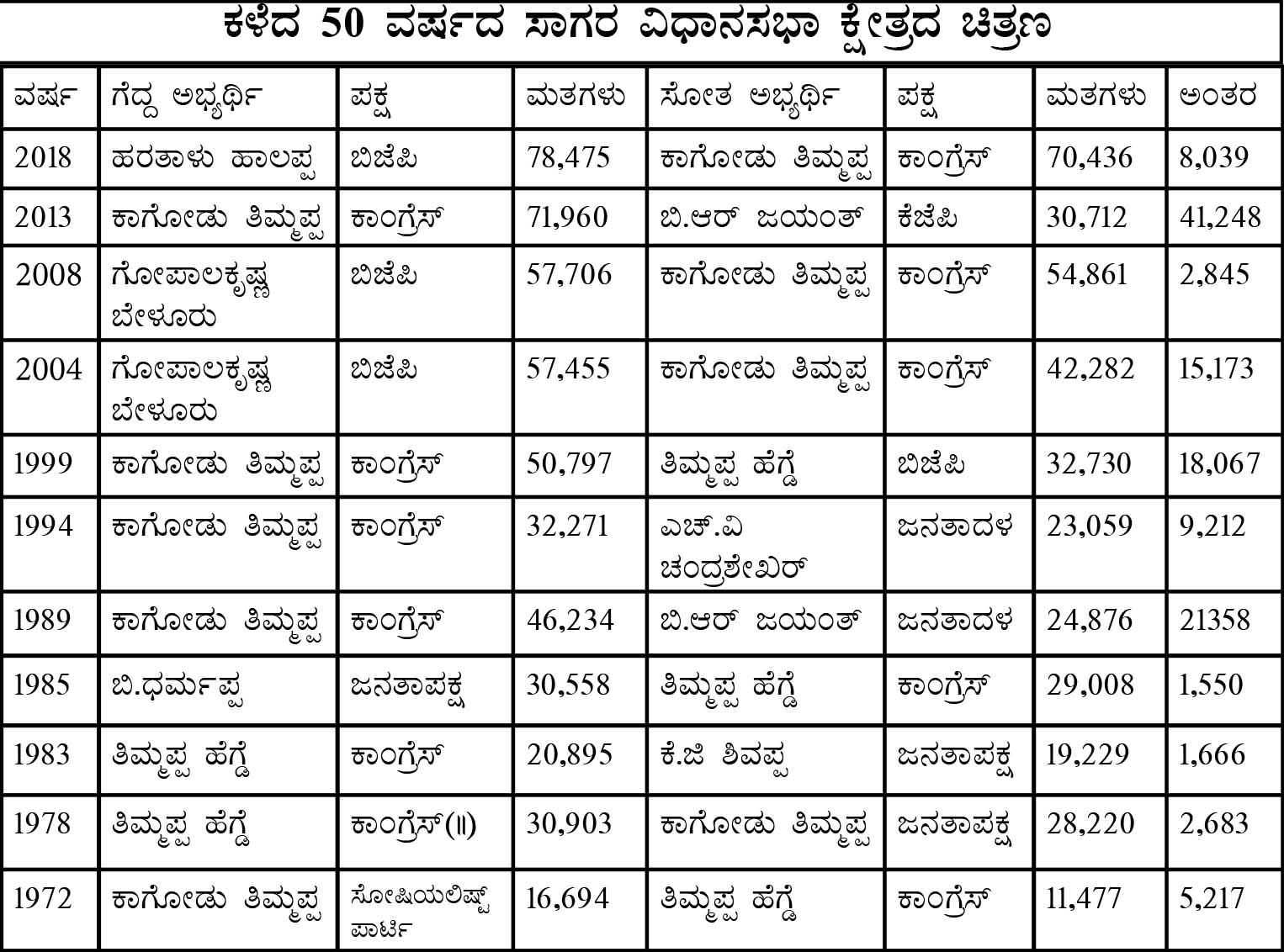 ಕಾಗೋಡು ರೈತ ಹೋರಾಟದ ಮುಂಚೂಣಿಯಲ್ಲಿದ್ದ-ಕಾನೂನು ವಿದ್ಯಾಭ್ಯಾಸ ಮುಗಿಸಿದ್ದ ಹಿಂದುಳಿದ ದೀವರ ಸಮುದಾಯದ ಗೇಣಿದಾರನ ಮಗ ಕಾಗೋಡು ತಿಮ್ಮಪ್ಪ 1962ರ ಚನಾವಣೆಯಲ್ಲಿ ಕಾಂಗ್ರೆಸ್‌ನ ವಿ.ಎಸ್.ಲಕ್ಷ್ಮೀಕಾಂತಪ್ಪರಿಗೆ ಮುಖಾಮುಖಿಯಾಗಿದ್ದರು. ಸಂಯುಕ್ತ ಸೋಷಲಿಸ್ಟ್ ಪಕ್ಷದ ತಿಮ್ಮಪ್ಪ (17,555) 3,299 ಓಟುಗಳ ಅಂತರದಲ್ಲಿ ಸೋತರು. ಸಾಗರ ವಿಧಾನಸಭಾ ಕ್ಷೇತ್ರದಲ್ಲಿ 11 ಚುನಾವಣೆ ಎದುರಿಸಿ 5 ಬಾರಿ ಗೆದ್ದು ಹಲವು ಸರಕಾರದಲ್ಲಿ ಮಂತ್ರಿ, ಸ್ಪೀಕರ್ ಆಗಿದ್ದ ಕಾಗೋಡು ತಿಮ್ಮಪ್ಪರ ಚುನಾವಣಾ ರಾಜಕಾರಣದ ಆರಂಭವಿದು. 1967ರಲ್ಲಿ ಸೋಷಲಿಸ್ಟ್ ಪಾರ್ಟಿಯ ತಿಮ್ಮಪ್ಪ (11,111) ಕಾಂಗ್ರೆಸ್‌ನ ಕೆ.ಎಚ್. ಶ್ರೀನಿವಾಸ್‌ರಿಗೆ (11,860) ಪ್ರಬಲ ಹೋರಾಟ ಕೊಟ್ಟರೂ ತೀರಾ ಸಣ್ಣ ಅಂತರದಲ್ಲಿ (749) ಸೋಲಬೇಕಾಯಿತು. 1972ರಲ್ಲಿ ಕಾಗೋಡು ತಿಮ್ಮಪ್ಪ 11,477 ಮತ ಪಡೆದಿದ್ದ ಕಾಂಗ್ರೆಸ್‌ನ ಎಲ್.ಟಿ.ತಿಮ್ಮಪ್ಪ ಹೆಗಡೆಯವರನ್ನು 5,217 ಮತದಿಂದ ಪರಾಭವಗೊಳಿಸಿ ಮೊದಲ ಬಾರಿ ವಿಧಾನಸಭೆಗೆ ಪ್ರವೇಶ ಪಡೆದರು.