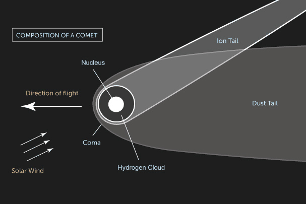 ಈ ಧೂಮಕೇತುಗಳನ್ನು ಸಣ್ಣ ಬಂಡೆಗಳ ಒಂದು ಉಂಡೆಗೆ ಹೋಲಿಸಬಹುದು. ಈ ಬಂಡೆಯನ್ನು ನ್ಯೂಕ್ಲಿಯಸ್ ಎಂದು ಕರೆಯುತ್ತಾರೆ. ಧೂಮಕೇತುವು ಸೂರ್ಯನ ಹತ್ತಿರ ಬರುತ್ತಿರುವಂತೆ ನ್ಯೂಕ್ಲಿಯಸ್ನಲ್ಲಿರುವ ವಸ್ತುವು ಆವಿಯಾಗಲು ಪ್ರಾರಂಭಿಸುತ್ತದೆ. ಇದು ನ್ಯೂಕ್ಲಿಯಸ್ ಸುತ್ತಲು ಸೇರಿಕೊಳ್ಳುತ್ತದೆ. ಇದನ್ನು ಕೋಮಾ ಎಂದು ಕರೆಯುತ್ತಾರೆ. ಹೀಗೆ ಆವಿಯಾದ ವಸ್ತುವು ಸೂರ್ಯನ ವಿರುದ್ಧ ದಿಕ್ಕಿನಲ್ಲಿ ಸೌರ ಮಾರುತದಿಂದ ತಳ್ಳಲ್ಪಟ್ಟು ಬಾಲವಾಗಿ ಹರಡಿಕೊಳ್ಳುತ್ತದೆ.