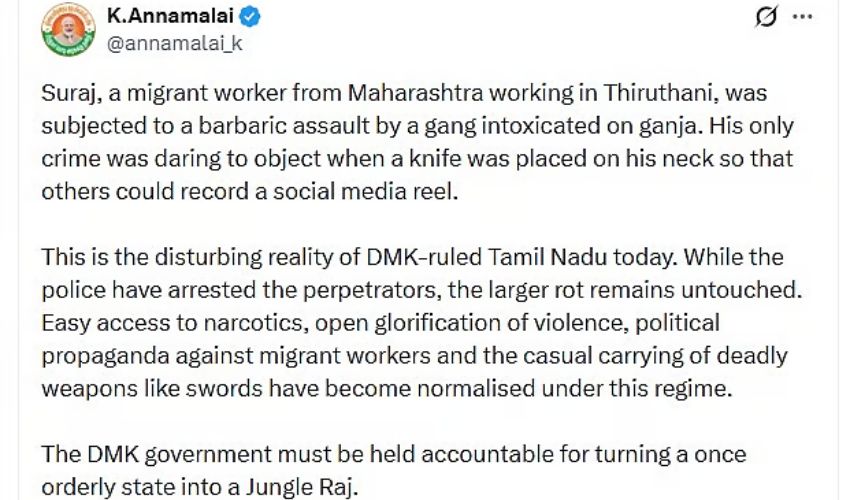 “ಇದು ಡಿಎಂಕೆ ಆಡಳಿತದ ತಮಿಳುನಾಡಿನ ಇಂದಿನ ಗೊಂದಲದ ವಾಸ್ತವ. ಪೊಲೀಸರು ಅಪರಾಧಿಗಳನ್ನು ಬಂಧಿಸಿದ್ದರೂ, ದೊಡ್ಡ ಪ್ರಮಾಣದ ಸಮಸ್ಯೆ ಇನ್ನೂ ಹಾಗೆಯೇ ಉಳಿದಿದೆ. ಮಾದಕ ವಸ್ತುಗಳ ಸುಲಭ ಪ್ರವೇಶ, ಹಿಂಸಾಚಾರದ ಬಹಿರಂಗ ವೈಭವೀಕರಣ, ವಲಸೆ ಕಾರ್ಮಿಕರ ವಿರುದ್ಧ ರಾಜಕೀಯ ಪ್ರಚಾರ ಮತ್ತು ಕತ್ತಿಗಳಂತಹ ಮಾರಕ ಆಯುಧಗಳನ್ನು ಆಕಸ್ಮಿಕವಾಗಿ ಸಾಗಿಸುವುದು ಈ ಆಡಳಿತದಲ್ಲಿ ಸಾಮಾನ್ಯವಾಗಿದೆ” ಎಂದು ಅಣ್ಣಾಮಲೈ ಆರೋಪಿಸಿದ್ದಾರೆ.
