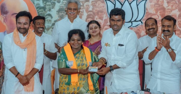 இன்றைய தினம், மாண்புமிகு மத்திய அமைச்சர் திரு @kishanreddybjp, மாண்புமிகு மத்திய இணையமைச்சர் திரு @Murugan_MoS, பாராளுமன்றத் தேர்தல் பொறுப்பாளர் திரு @MenonArvindBJP ஆகியோர் முன்னிலையில், கட்சியில் மீண்டும் இணைந்துள்ள அக்கா திருமதி @DrTamilisaiGuv அவர்களை வரவேற்று மகிழ்கிறேன்.… pic.twitter.com/oAP1W6HuNR