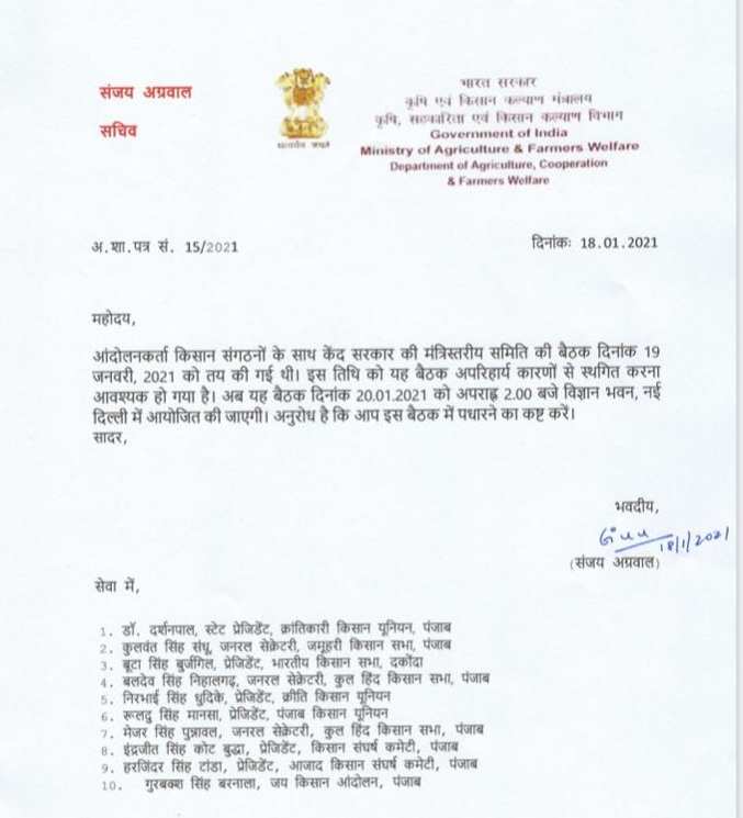 ಇಂದು ನಡೆಯಬೇಕಿದ್ದ ರೈತ ಪ್ರತಿನಿಧಿಗಳ ಜೊತೆಗಿನ 10ನೇ ಸುತ್ತಿನ ಮಾತುಕತೆಯನ್ನು ಕೇಂದ್ರ ಸರ್ಕಾರ ಒಂದು ದಿನ ಮುಂದೂಡಿದೆ. ಅಂದರೆ ಸಭೆಯು ಜನವರಿ 20 ರಂದು ನಡೆಯಲಿದೆ ಎಂದು ತಿಳಿಸಿದೆ. ಇದಕ್ಕೆ ತಳ್ಳಿಹಾಕಲಾಗದ ಕಾರಣಗಳಿವೆ ಎಂದು ಕೇಂದ್ರ ಹೇಳಿದೆ.