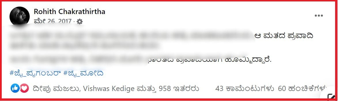 “#ಜೈಪೈಗಂಬರ್‌ #ಜೈಮೋದಿ” ಹ್ಯಾಷ್‌ಟ್ಯಾಗ್‌ನಲ್ಲಿ ಬರೆದಿರುವ ರೋಹಿತ್‌ ಚಕ್ರತೀರ್ಥ ಅವರು ಪ್ರಧಾನಿ ಮೋದಿಯವರನ್ನು ಪ್ರವಾದಿ ಮುಹಮ್ಮದ್ ಪೈಗಂಬರ್‌ ಅವರಿಗೆ ಹೋಲಿಸಿ ಬರೆದಿದ್ದಾರೆ.
