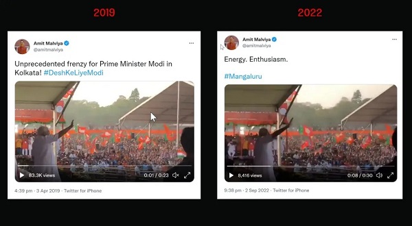 ಹಾಗಾಗಿ ಕೋಲ್ಕತ್ತಾದ ಬಿಜೆಪಿ ರ್ಯಾಲಿಯ ಹಳೆಯ ವೀಡಿಯೊವನ್ನು ಅಮಿತ್ ಮಾಳವಿಯಾ ಮತ್ತು ಪ್ರೀತಿ ಗಾಂಧಿ ಸೇರಿದಂತೆ ಬಿಜೆಪಿಯ ರಾಜಕಾರಣಿಗಳು ಇತ್ತೀಚೆಗೆ ಹಂಚಿಕೊಂಡಿದ್ದಾರೆ ಎಂಬುದು ಸ್ಪಷ್ಟವಾಗಿದೆ. ಕೆಲವರು ಈ ವಿಡಿಯೋವನ್ನು ಕಚ್ನ ಕಾರ್ಯಕ್ರಮದೆಂದು ಹೇಳಿಕೊಂಡರೆ, ಇನ್ನು ಕೆಲವರು ಮಂಗಳೂರಿನ ವಿಡಿಯೋ ಎಂದು ಶೇರ್ ಮಾಡಿದ್ದಾರೆ. 2019ರಲ್ಲಿ ಕೋಲ್ಕತ್ತಾ ರ್ಯಾಲಿಯ ನಂತರ ಮಾಳವಿಯಾ ಮತ್ತು ಪ್ರೀತಿ ಗಾಂಧಿ ಇಬ್ಬರೂ ಒಂದೇ ವೀಡಿಯೊವನ್ನು ಹಂಚಿಕೊಂಡಿದ್ದರು.