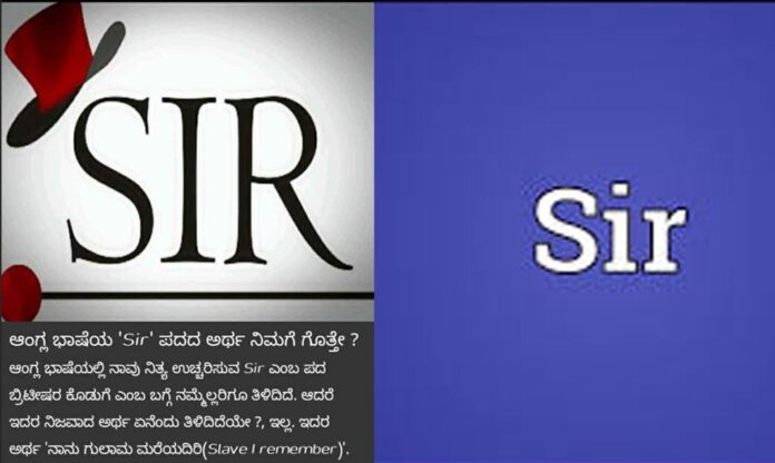 Sir ಎಂಬುದರ ಪೂರ್ಣ ರೂಪ Slave I Remember (ನಾನು ಗುಲಾಮ ಮರೆಯದಿರಿ) ಎಂಬರ್ಥವಿದೆ ಮತ್ತು Slave I Remain ಗುಲಾಮನಾಗಿಯೇ ಇರುತ್ತೇನೆ ಎಂದು ಪೋಸ್ಟ್ ಒಂದು ಸಾಮಾಜಿಕ ಜಾಲತಾಣಗಳಲ್ಲಿ ಹರಿದಾಡುತ್ತಿದೆ. ಬ್ರೀಟಿಷರು ತಮ್ಮ ಆಡಳಿತದ ಕಾಲದಲ್ಲಿ ಭಾರತೀಯರನ್ನು ಹೀಯಾಳಿಸುವ ಸಲುವಾಗಿ ಹೀಗೆ ಬಳಸುವಂತೆ ಮಾಡಿದರೆ ಎಂದು ಪ್ರತಿಪಾದಿಸಲಾಗಿದೆ. ಇದು ನಿಜವೇ ಎಂಬುದನ್ನು ಪರಿಶೀಲಿಸೋಣ.