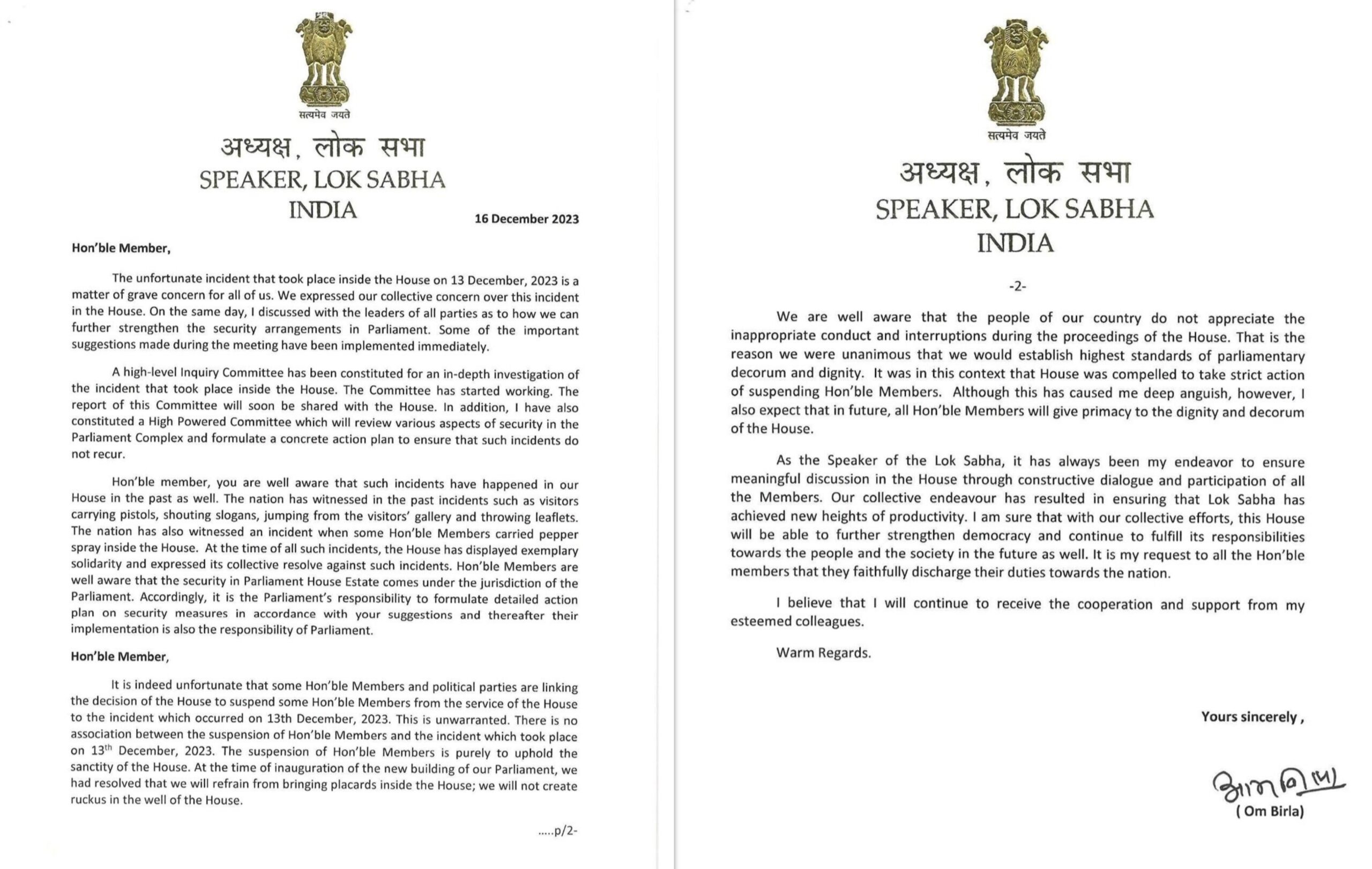 ‘ಗೌರವಾನ್ವಿತ ಸದಸ್ಯರೇ, ಡಿಸೆಂಬರ್ 13, 2023ರಂದು ಸದನದೊಳಗೆ ನಡೆದ ಅಹಿತಕರ ಘಟನೆಯು ನಮ್ಮೆಲ್ಲರಿಗೂ ಗಂಭೀರ ಕಾಳಜಿಯ ವಿಷಯವಾಗಿದ್ದು, ಈ ಬಗ್ಗೆ ನಾವು ನಮ್ಮ ಸಾಮೂಹಿಕ ಕಳವಳವನ್ನು ವ್ಯಕ್ತಪಡಿಸಿದ್ದೇವೆ. ಇದೆಲ್ಲಾ ಹೇಗೆ ಸಾಧ್ಯವಾಯಿತು ಎಂದು ಅದೇ ದಿನ ನಾವು ಎಲ್ಲ ಪಕ್ಷಗಳ ಮುಖಂಡರೊಂದಿಗೆ ಚರ್ಚಿಸಿದ್ದೇವೆ. ಸಂಸತ್ತಿನಲ್ಲಿ ಭದ್ರತಾ ವ್ಯವಸ್ಥೆಯನ್ನು ಮತ್ತಷ್ಟು ಬಲಪಡಿಸುವುದರ ಜತೆಗೆ, ಸಭೆಯಲ್ಲಿ ನೀಡಿದ ಕೆಲವು ಪ್ರಮುಖ ಸಲಹೆಗಳನ್ನು ತಕ್ಷಣದಿಂದಲೇ ಜಾರಿಗೊಳಿಸಲಾಗಿದೆ’ ಎಂದು ಹೇಳಿದ್ದಾರೆ.