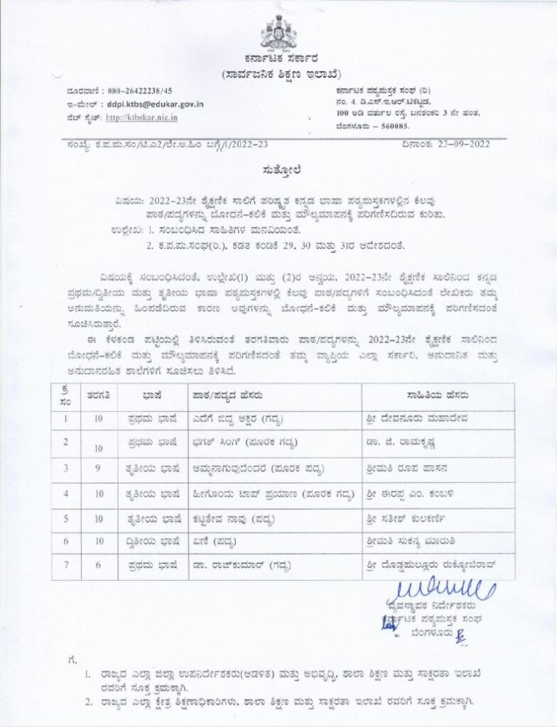 ಇದರ ನಂತರ ರಾಜ್ಯ ಶಿಕ್ಷಣ ಇಲಾಖೆ ಸುತ್ತೋಲೆ ಹೊರಡಿಸಿ ದೇವನೂರು ಮಹಾದೇವ ಅವರ ‘ಎದೆಗೆ ಬಿದ್ದ ಅಕ್ಷರ’, ಡಾ.ಜಿ. ರಾಮಕೃಷ್ಣ ಅವರ ‘ಭಗತ್ ಸಿಂಗ್’, ರೂಪ ಹಾಸನ ಅವರ ‘ಅಮ್ಮನಾಗುವುದೆಂದರೆ’, ಈರಪ್ಪ ಎಂ. ಕಂಬಳಿ ಅವರ ‘ಹೀಗೊಂದು ಟಾಪ್ ಪ್ರಯಾಣ’, ಸತೀಶ್ ಕುಲಕರ್ಣಿ ಅವರ ‘ಕಟ್ಟತೇವ ನಾವು’, ಸುಕನ್ಯ ಮಾರುತಿ ಅವರ ‘ಏಣಿ’ ಹಾಗೂ ದೊಡ್ಡಹುಲ್ಲೂರು ರುಕ್ಕೋಜಿ ರಾವ್ ಅವರು ಬರೆದಿರುವ ‘ಡಾ. ರಾಜ್ಕುಮಾರ್’ ಅವರು ಪಠ್ಯಗಳನ್ನು ಬೋಧನೆ-ಕಲಿಕೆ ಮತ್ತು ಮೌಲ್ಯಮಾಪನಕ್ಕೆ ಪರಿಗಣಿಸದಂತೆ ಶಾಲೆಗಳಿಗೆ ಸೂಚಿಸುವಂತೆ ಹೇಳಿದೆ.
