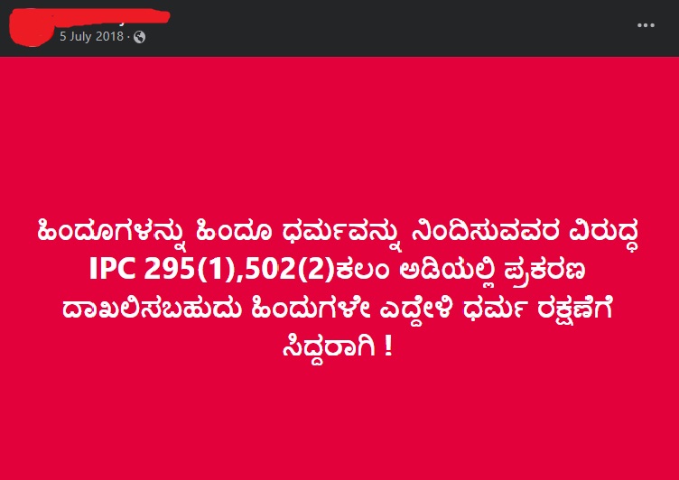 ನಿಜಾಂಶ: ಭಾರತೀಯ ದಂಡ ಸಂಹಿತೆ (IPC) ಯಲ್ಲಿ 295 (1), 502 (2) ವಿಭಾಗಗಳು ಅಸ್ತಿತ್ವದಲ್ಲಿಲ್ಲ. ಐಪಿಸಿಯ ಸೆಕ್ಷನ್ 295 ಮತ್ತು 295ಎ ಧಾರ್ಮಿಕ ಅಪರಾಧಗಳಿಗೆ ಸಂಬಂಧಿಸಿದೆ. ನಿರ್ದಿಷ್ಟವಾಗಿ ಹಿಂದೂ ಧರ್ಮ ಮಾತ್ರವಲ್ಲದೆ, ಇದು ಎಲ್ಲಾ ಧರ್ಮಗಳಿಗೆ ಸಂಬಂಧಿಸಿದೆ. ಐಪಿಸಿಯ ಸೆಕ್ಷನ್ 502 ಮಾನನಷ್ಟಕ್ಕೆ ಸಂಬಂಧಿಸಿದ್ದೇ ಹೊರತು ಧರ್ಮದ ಬಗ್ಗೆ ಅಲ್ಲ. ಆದ್ದರಿಂದ, ಪೋಸ್ಟ್ ಮೂಲಕ ಹೇಳಿರುವುದು ತಪ್ಪುದಾರಿಗೆಳೆಯುವಂತಿದೆ.
