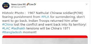 ಅಂತಹದೆ ಒಂದು ಸುಳ್ಳುಗಳಲ್ಲಿ, ಚಿತ್ರವೊಂದನ್ನು 1967 ರ ’ನಾಥು ಲಾ’ ದಲ್ಲಿನ ಭಾರತ-ಚೀನಾ ನಡುವಿನ ಘರ್ಷಣೆಯಲ್ಲಿನ ಚೀನಾದ ಯುದ್ಧ ಕೈದಿಯೊಬ್ಬನ ಚಿತ್ರವೆಂದು ಹೇಳಿ ಹಂಚಿಕೊಳ್ಳಲಾಗುತ್ತಿದೆ. ಸಂಘರ್ಷದಲ್ಲಿ ಸೋತದ್ದರಿಂದ ಚೀನಾ ಸೇನೆಯಿಂದ ಶಿಕ್ಷೆಯಾಗಬಹುದೆಂದು ಹೆದರಿ ಈ ಖೈದಿ ಹಿಂತಿರುಗಲು ಬಯಸದೆ ಅಳುತ್ತದ್ದಾನೆ ಎಂದು ಬರೆದು ಹಂಚಲಾಗುತ್ತಿದೆ.