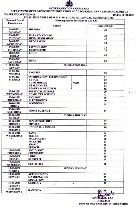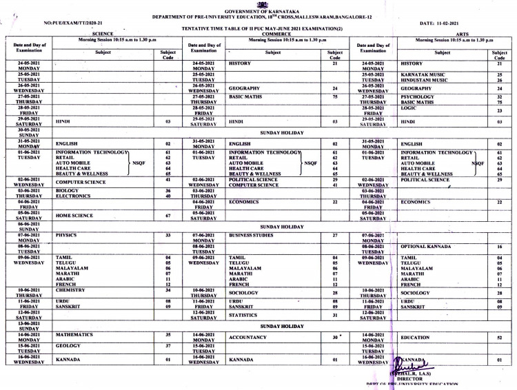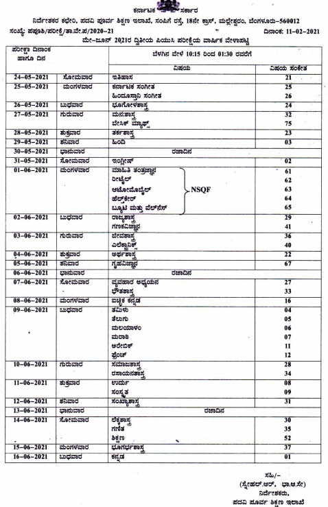 2020-21ನೇ ಸಾಲಿನ ಶೈಕ್ಷಣಿಕ ವರ್ಷದ ದ್ವಿತೀಯ ಪಿಯುಸಿ ಪರೀಕ್ಷೆಗಳ ಅಧಿಕೃತ ವೇಳಾಪಟ್ಟಿಯನ್ನು ಪ್ರಾಥಮಿಕ ಮತ್ತು ಪ್ರೌಢಶಿಕ್ಷಣ ಸಚಿವ ಎಸ್. ಸುರೇಶ್ ಕುಮಾರ್ ಪ್ರಕಟಿಸಿದ್ದು, ಪಿಯು ಪರೀಕ್ಷೆಗಳು ಮೇ. 24 ರಿಂದ ಜೂ. 16ರವರೆಗೆ ನಡೆಯಲಿವೆ ಎಂದು ತಿಳಿಸಿದ್ದಾರೆ.
