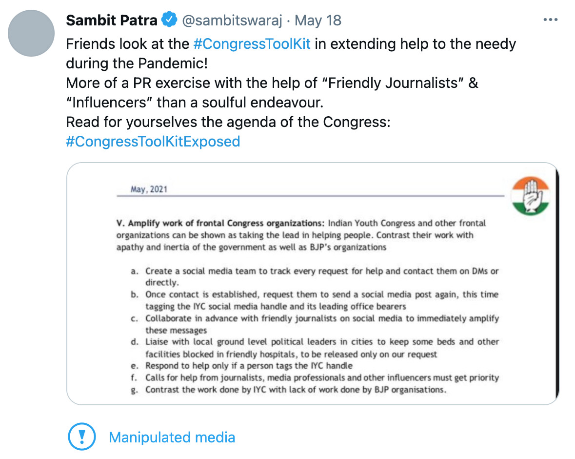 ಬಿಜೆಪಿ ವಕ್ತಾರ ಸಂಬೀತ್ ಪಾತ್ರಾ ಅವರು, ಪ್ರಧಾನ ಮಂತ್ರಿ ನರೇಂದ್ರ ಮೋದಿಯವರಿಗೆ ಸಾಂಕ್ರಾಮಿಕ ರೋಗವನ್ನು ನಿಭಾಯಿಸಲು ಅಡ್ಡಿ ಮಾಡುವ ಬಗ್ಗೆ ಕಾಂಗ್ರೆಸ್ ‘ಟೂಲ್ಕಿಟ್’ ಎಂದು ಆರೋಪಿಸಿದ ಟ್ವೀಟ್ ಸ್ಕ್ರೀನ್ ಶಾಟ್ಗಳನ್ನು ಉಲ್ಲೇಖಿಸಿದ ಟ್ವೀಟರ್, ಇದೊಂದು ‘ಮ್ಯಾನಿಪುಲೆಟೆಡ್ ಮೀಡಿಯಾ’ (ತಿರುಚಲಾದ ವಿಷಯ) ಎಂದು ತಿಳಿಸಿದೆ. ಆ ಮೂಲಕ ಬಿಜೆಪಿಯ ಸುಳ್ಳು ಅಭಿಯಾನಕ್ಕೆ ತಡೆ ಒಡ್ಡಿದೆ.