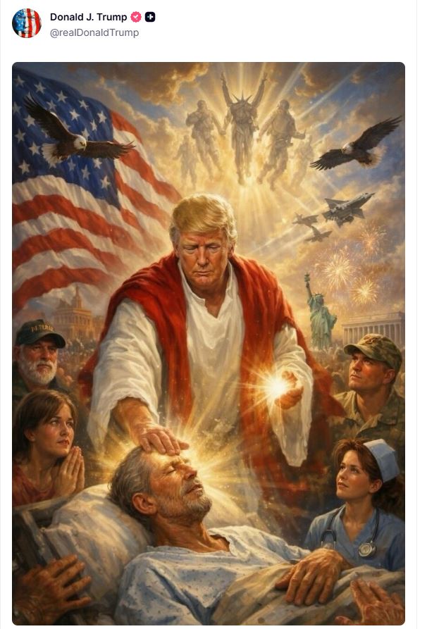 ಈ ಮಧ್ಯೆ ಟ್ರಂಪ್  ಸ್ವತಃ ತಾವೇ ಯೇಸುಕ್ರಿಸ್ತನಂತೆಯೇ ಸಂತರಂತಹ ಶಕ್ತಿಗಳನ್ನು ಹೊಂದಿರುವಂತೆ ತೋರಿಸುವ ಚಿತ್ರವನ್ನು ಪೋಸ್ಟ್ ಮಾಡಿದ್ದಾರೆ. ಬೈಬಲ್ ಶೈಲಿಯ ನಿಲುವಂಗಿಯನ್ನು ಧರಿಸಿದ ಟ್ರಂಪ್, ಹಾಸಿಗೆ ಹಿಡಿದ ವ್ಯಕ್ತಿಯ ಮೇಲೆ ಕೈ ಇಡುತ್ತಿರುವಾಗ ಅವರ ಬೆರಳುಗಳಿಂದ ಬೆಳಕು ಹೊರಹೊಮ್ಮುತ್ತಿದೆ, ಆದರೆ ಸೈನಿಕ, ನರ್ಸ್, ಪ್ರಾರ್ಥನೆ ಸಲ್ಲಿಸುತ್ತಿರುವ ಮಹಿಳೆ ಮತ್ತು ಬೇಸ್‌ಬಾಲ್ ಕ್ಯಾಪ್ ಧರಿಸಿದ ಗಡ್ಡಧಾರಿ ವ್ಯಕ್ತಿ ಎಲ್ಲರೂ ಮೆಚ್ಚುಗೆಯಿಂದ ನೋಡುತ್ತಿದ್ದಾರೆ. ಮೇಲಿನ ಆಕಾಶವು ಹದ್ದುಗಳು, ಅಮೇರಿಕನ್ ಧ್ವಜ ಮತ್ತು ಆವಿಯ ಚಿತ್ರಗಳಿಂದ ತುಂಬಿದೆ.