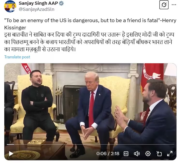 ಟ್ರಂಪ್ ಮತ್ತು ಝೆಲೆನ್ಸ್ಕಿ ನಡುವಿನ ವಿಡಿಯೊವನ್ನು ಎಕ್ಸ್‌ನಲ್ಲಿ ಪೋಸ್ಟ್‌ ಮಾಡಿರುವ ಸಂಜಯ್ ಸಿಂಗ್, ಈ ಸಂಭಾಷಣೆಯಲ್ಲಿ ಟ್ರಂಪ್ ಬೆದರಿಸುತ್ತಿದ್ದಾರೆ ಎಂಬುದು ಸಾಬೀತಾಗಿದೆ. ಆದ್ದರಿಂದ ಮೋದಿ ಅವರು ಟ್ರಂಪ್ ಅವರ ಕೈಗೊಂಬೆಯಾಗುವ ಬದಲು, ಅಪರಾಧಿಗಳಂತೆ ಸಂಕೋಲೆಗಳಲ್ಲಿ ಭಾರತೀಯರನ್ನು ಭಾರತಕ್ಕೆ ಕತೆತರುವ ವಿಷಯದ ಬಗ್ಗೆ ಗಟ್ಟಿಯಾಗಿ ಧ್ವನಿಯೆತ್ತಬೇಕು ಎಂದು ಹೇಳಿದ್ದಾರೆ.