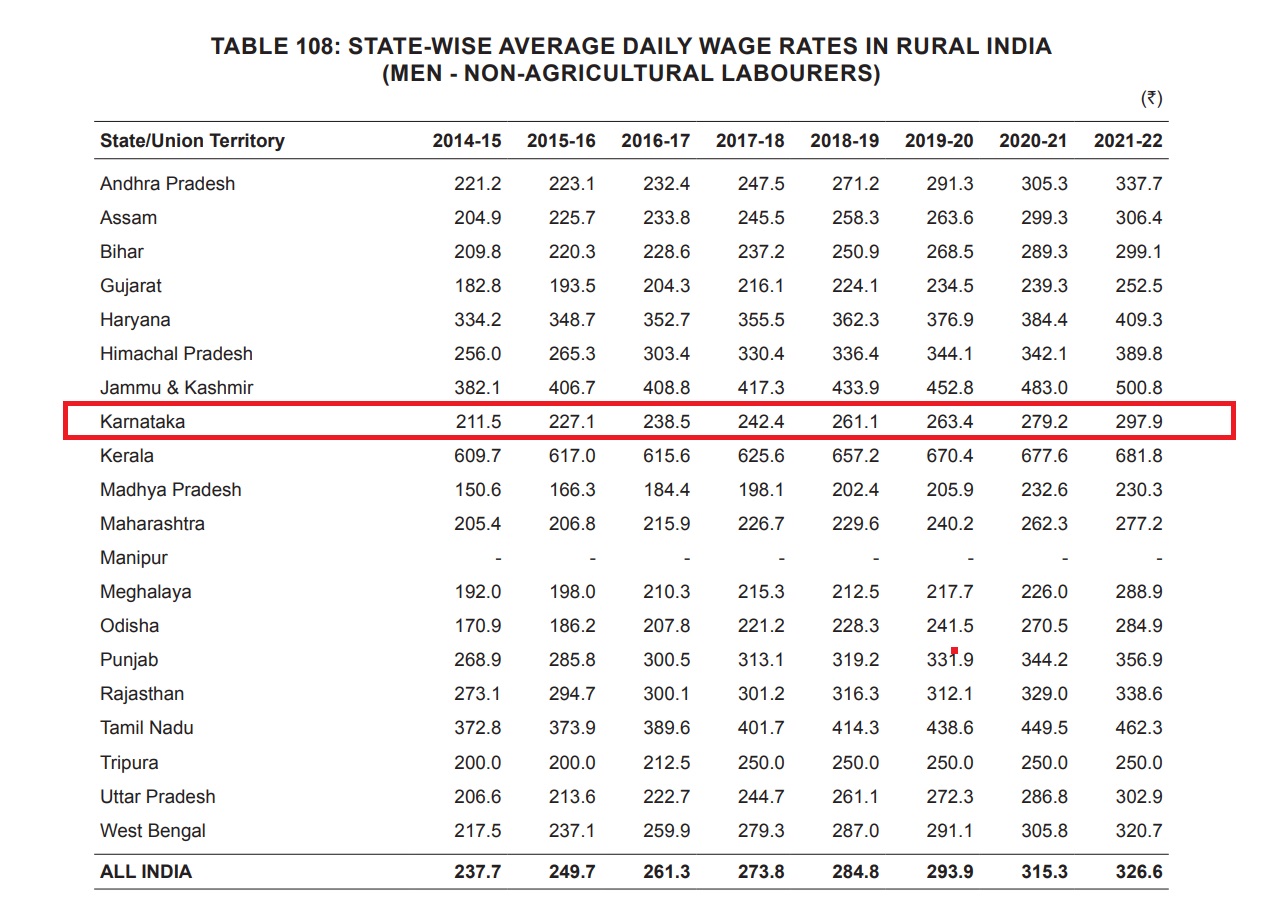 ಕರ್ನಾಟಕವು ಕೃಷಿಯೇತರ ಕೂಲಿ ಕಾರ್ಮಿಕರಿಗೆ 297.9 ರೂ. ಸರಾಸರಿ ಕೂಲಿ ನೀಡುತ್ತದೆ. ಇದು ರಾಷ್ಟ್ರೀಯ ಸರಾಸರಿಗಿಂತ 326.6. ರೂ. ಗಿಂತಲೂ ಕಡಿಮೆಯಾಗಿದೆ.