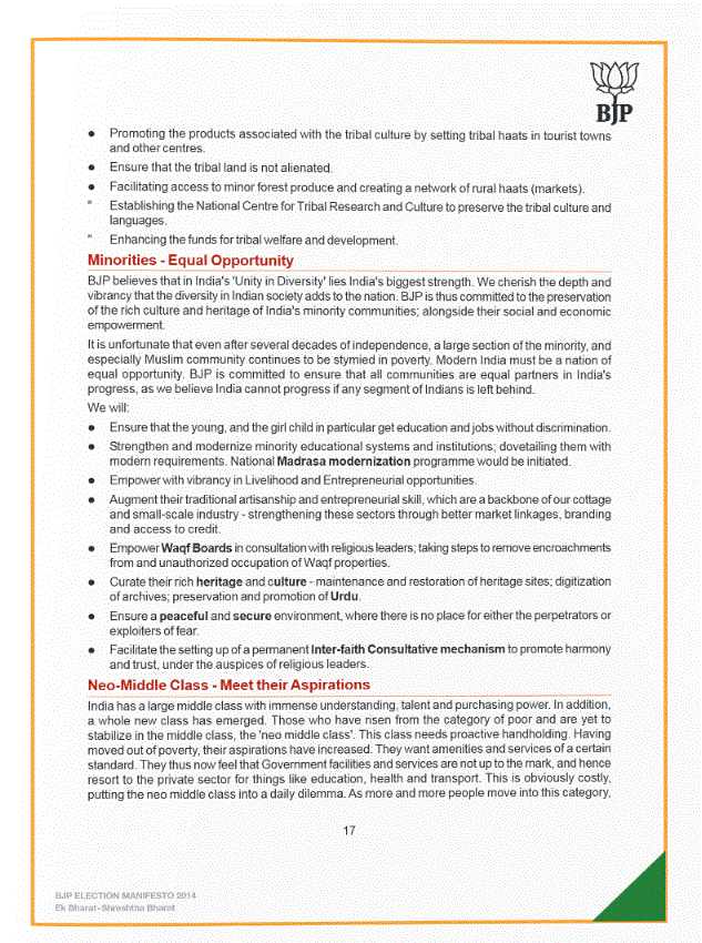 ಅಲ್ಲಿಯೇ ಕೆಳಗಿನ ಪ್ಯಾರಾದಲ್ಲಿ “ಅಲ್ಪ ಸಂಖ್ಯಾತರ ಸಂಸ್ಕೃತಿ ಮತ್ತು ಸ್ಮಾರಕಗಳನ್ನು ರಕ್ಷಣೆ ಮಾಡಲಾಗುವುದು. ಉರ್ದು ಭಾಷೆಯ ಸಂರಕ್ಷಣೆ ಮತ್ತು ಪ್ರಚಾರ ಮಾಡಲಾಗುವುದು” ಎಂದು ಭರವಸೆ ಕೊಟ್ಟಿರುವುದು ಗಮನಾರ್ಹ.