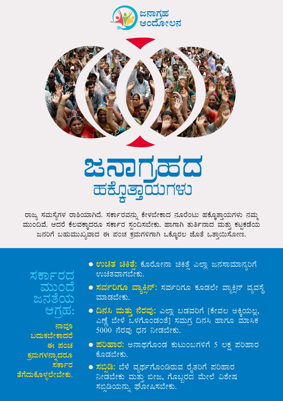ಜನರ ಜೀವ ಮತ್ತು ಜೀವನೋಪಾಯ ಉಳಿಸಲು ಸರ್ಕಾರ ಕೈಗೊಳ್ಳಬೇಕಾದ ಪಂಚ ತುರ್ತು ಕ್ರಮಗಳ ಬಗ್ಗೆ ತಿಂಗಳಿನಿಂದ ಹೋರಾಟ ಮಾಡುತ್ತಿರುವ ಜನಾಗ್ರಹ ಆಂದೋಲನವು ನಾಳೆ [ಮೇ 24 ರಂದು] ರಾಜ್ಯವ್ಯಾಪಿ ಜನಾಗ್ರಹಕ್ಕೆ ಕರೆ ನೀಡಿದೆ. ಜನರ ಜೀವ ಉಳಿಸುವ ಕ್ರಮಗಳಿಗಾಗಿ ಹಾಗೂ ಸಂಕಷ್ಟದಲ್ಲಿರುವ ಜನರ ಜೀವನೋಪಾಯಕ್ಕೆ ಆಸರೆಯಾಗಬಲ್ಲ ಪ್ಯಾಕೇಜಿಗಾಗಿ ತಮ್ಮ ತಮ್ಮ ಮನೆ ಮುಂದೆಯೇ ತಟ್ಟೆ ಲೋಟ ಬಡಿದು, ಖಾಲಿ ಚೀಲ ಪ್ರದರ್ಶಿಸುವ ಮೂಲಕ ಸರ್ಕಾರದ ಕಣ್ತೆರೆಸಲು ಮುಂದಾಗಿದೆ.