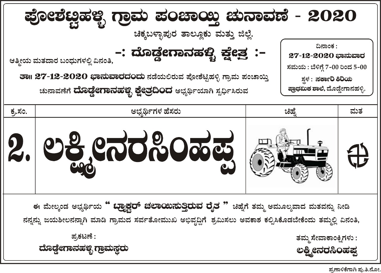ಜಿಲ್ಲೆಯ ಪೋಶೆಟ್ಟಿಹಳ್ಳಿ ಗ್ರಾಮ ಪಂಚಾಯ್ತಿಯ ದೊಡ್ಡೇಗಾನಹಳ್ಳಿ ಕ್ಷೇತ್ರದ ಅಭ್ಯರ್ಥಿಯಾದ ಲಕ್ಷ್ಮೀನರಸಿಂಹಪ್ಪ ಎಂಬುವವರು ದೊಡ್ಡಗಾನಹಳ್ಳಿ ಗ್ರಾಮದ ಚುನಾವಣಾ ಪ್ರಣಾಳಿಕೆ ಬಿಡುಗಡೆಗೊಳಿಸಿದ್ದಾರೆ. ಶಾಲೆ ಅಭಿವೃದ್ದಿ, ಗ್ರಂಥಾಲಯ ನಿರ್ಮಾಣ, ಕಾರ್ಮಿಕರಿಗೆ ಕೆಲಸ, ನೈರ್ಮಲ್ಯ ಕಾಪಾಡುವುದು ಸೇರಿದಂತೆ ಹಲವು ಜನಪರ ಕೆಲಸ ಮಾಡುವುದಾಗಿ ಘೋಷಿಸಿದ್ದಾರೆ. ಇತ್ತೀಚೆಗೆ ತುಮಕೂರಿನ ಕಲ್ಕೆರೆ ಗ್ರಾಮದ ಮಹಿಳೆಯೊಬ್ಬರ ಪ್ರಣಾಳಿಕೆ ವೈರಲ್ ಆಗಿತ್ತು. ಆದರೆ ಅದರಲ್ಲಿ ಸೋತರೆ ತೊಂದರೆ ಕೊಡುತ್ತೇನೆ ಎಂಬ ಧಮಕಿ ಇದ್ದ ಕಾರಣ ಅವರ ವಿರುದ್ಧ ದೂರು ಸಹ ದಾಖಲಾಗಿತ್ತು. ಆದರೆ ದೊಡ್ಡೇಗಾನಹಳ್ಳಿಯ ಪ್ರಣಾಳಿಕೆಯು ಗ್ರಾಮದ ಅಭಿವೃದ್ದಿಯ ಸಮಗ್ರ ನೋಟ ಒಳಗೊಂಡಿರುವುದರಿಂದ ಎಲ್ಲರ ಗಮನ ಸೆಳೆದಿದೆ.