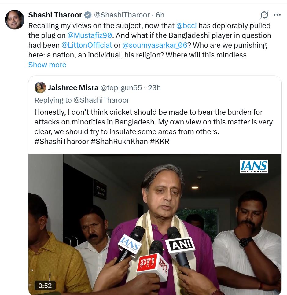 ಬಿಸಿಸಿಐನ ನಡೆಯನ್ನು ಪ್ರಶ್ನಿಸಿರುವ ತರೂರ್, ಸಂಬಂಧಪಟ್ಟ ಆಟಗಾರ ಬಾಂಗ್ಲಾದೇಶದ ಕ್ರಿಕೆಟಿಗರಾದ ಲಿಟ್ಟನ್ ದಾಸ್ ಅಥವಾ ಸೌಮ್ಯ ಸರ್ಕಾರ್ ಆಗಿದ್ದರೆ, ಇಬ್ಬರೂ ಹಿಂದೂಗಳಾಗಿದ್ದರೆ ಪ್ರತಿಕ್ರಿಯೆ ಏನಾಗುತ್ತಿತ್ತು ಎಂದು ಪ್ರಶ್ನಿಸಿದ್ದಾರೆ. “ನಾವು ಇಲ್ಲಿ ಯಾರನ್ನು ಶಿಕ್ಷಿಸುತ್ತಿದ್ದೇವೆ – ಒಂದು ರಾಷ್ಟ್ರ, ಒಬ್ಬ ವ್ಯಕ್ತಿ, ಅವನ ಧರ್ಮ? ಕ್ರೀಡೆಯ ಈ ಬುದ್ದಿಹೀನ ರಾಜಕೀಯೀಕರಣವು ನಮ್ಮನ್ನು ಎಲ್ಲಿಗೆ ಕರೆದೊಯ್ಯುತ್ತದೆ?” ಅವರು ತಮ್ಮ ಸಾಮಾಜಿಕ ಜಾಣತಾಣ X ನಲ್ಲಿ ಬರೆದಿದ್ದಾರೆ.