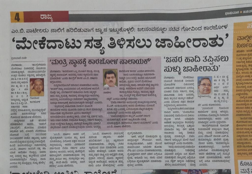 ಜಾಹೀರಾತು ಪ್ರಕಟವಾದ ಒಂದು ದಿನ ಬಳಿಕ ಜಾಹೀರಾತು ಕುರಿತು ‘ಪ್ರಜಾವಾಣಿ’ ಪತ್ರಿಕೆಯಲ್ಲಿ ವರದಿಯೊಂದು ಪ್ರಕಟವಾಗಿದೆ. ಜಲಸಂಪನ್ಮೂಲ ಸಚಿವ ಗೋವಿಂದ ಕಾರಾಜೋಳ ಅವರು ಸುದ್ದಿಗಾರರೊಂದಿಗೆ ಮಾತನಾಡುತ್ತಾ, “ಕಾಂಗ್ರೆಸ್‌ನವರು ಮೇಕೆದಾಟು ವಿಚಾರದಲ್ಲಿ ರಾಜಕೀಯ ಮಾಡುತ್ತಿದ್ದಾರೆ. ರಾಜಕೀಯವಾಗಿಯೇ ಉತ್ತರ ಕೊಡಲು ಸತ್ಯವನ್ನು ತಿಳಿಸಿದ್ದೇವೆ. ಜಾಹೀರಾತಿನಲ್ಲಿ ನಾನು ನನ್ನ ಅಥವಾ ಮುಖ್ಯಮಂತ್ರಿಯವರ ಫೋಟೋ ಹಾಕಿಕೊಂಡಿಲ್ಲ. ಜನರಿಗೆ ಇದ್ದದನ್ನು ಇದ್ದಂತೆ ತೋರಿಸಿದ್ದೇವೆ. ಸರ್ಕಾರದ ಕಡತದಲ್ಲಿದ್ದ ಮಾಹಿತಿಯನ್ನು ಮುಂದಿಟ್ಟಿದ್ದೇವೆ” ಎಂದಿದ್ದಾರೆ.