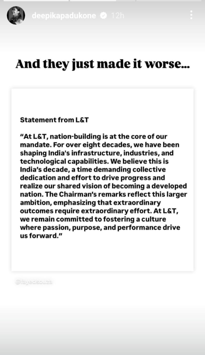 ಉದ್ಯೋಗಿಗಳು ವಾರದಲ್ಲಿ 90 ಗಂಟೆ ಕೆಲಸ ಮಾಡಬೇಕು ಎಂಬ ತಮ್ಮ ಮುಖ್ಯಸ್ಥನ ಹೇಳಿಕೆಯನ್ನು ಎಲ್ ಆ್ಯಂಡ್ ಟಿ ಕಂಪನಿ ಸಮರ್ಥಿಸಿಕೊಂಡಿದೆ. “ರಾಷ್ಟ್ರ ನಿರ್ಮಾಣದಲ್ಲಿನ ತನ್ನ ಬದ್ಧತೆಯನ್ನು ಸುಬ್ರಹ್ಮಣ್ಯನ್ ಅವರು ತನ್ನ ಹೇಳಿಕೆಗಳ ಮೂಲಕ ವ್ಯಕ್ತಪಡಿಸಿದ್ದಾರೆ. ಇದು ಅಸಾಧಾರಣ ಫಲಿತಾಂಶಗಳನ್ನು ಸಾಧಿಸುವ ಅವರ ದೃಷ್ಟಿಕೋನವನ್ನು ಪ್ರತಿಬಿಂಬಿಸುತ್ತವೆ. ಅಲ್ಲದೆ, ಭಾರತದ ಪ್ರಗತಿಯನ್ನು ಹೆಚ್ಚಿಸಲು ಸಾಮೂಹಿಕ ಸಮರ್ಪಣೆ ಮತ್ತು ಪ್ರಯತ್ನವನ್ನು ಸುಬ್ರಹ್ಮಣ್ಯನ್ ಕೋರಿದ್ದಾರೆ” ಎಂದು ಹೇಳಿಕೆಯಲ್ಲಿ ತಿಳಿಸಿದೆ.