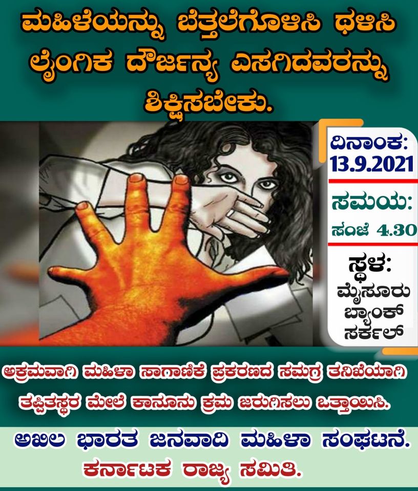 ಘಟನೆಯನ್ನು ವಿರೋಧಿಸಿ ಮತ್ತು ತಪ್ಪಿತಸ್ಥರ ವಿರುದ್ದ ಕಾನೂನು ಕ್ರಮ ಜರುಗಿಸಲು ಸೋಮವಾರ(ಇಂದು) ಸಂಜೆ 4.30ಕ್ಕೆ ಬೆಂಗಳೂರಿನ ಮೈಸೂರು ವೃತ್ತದಲ್ಲಿ ‘ಅಖಿಲ ಭಾರತ ಜನವಾದಿ ಮಹಿಳಾ ಸಂಘಟನೆ’ಯಿಂದ ಪ್ರತಿಭಟನೆ ನಡೆಯಲಿದೆ.