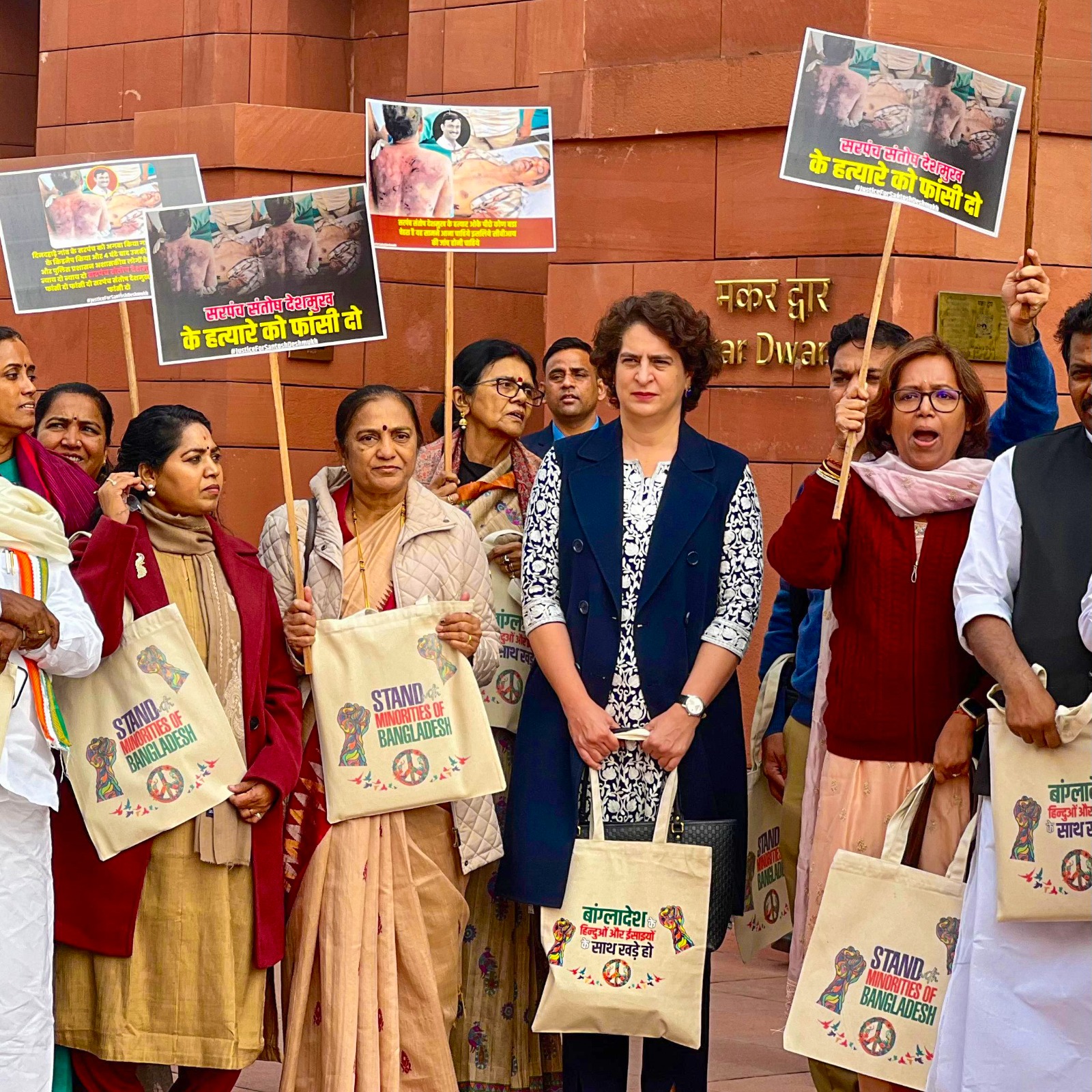 ಇಂದು, ತನ್ನ ಭುಜದ ಮೇಲೆ ‘ಬಾಂಗ್ಲಾದೇಶ’ ಬ್ಯಾಗ್ನೊಂದಿಗೆ, ಮಂಗಳವಾರ ಸಂಸತ್ ಆವರಣದಲ್ಲಿ ಬಾಂಗ್ಲಾದೇಶದಲ್ಲಿ ಹಿಂದೂಗಳು ಮತ್ತು ಕ್ರಿಶ್ಚಿಯನ್ನರ ಮೇಲೆ ನಡೆದ ದೌರ್ಜನ್ಯದ ವಿರುದ್ಧ ಕಾಂಗ್ರೆಸ್ ಸಂಸದರು ನಡೆಸಿದ ಪ್ರತಿಭಟನೆಯನ್ನು ಪ್ರಿಯಾಂಕಾ ಗಾಂಧಿ ಮುನ್ನಡೆಸಿದರು.