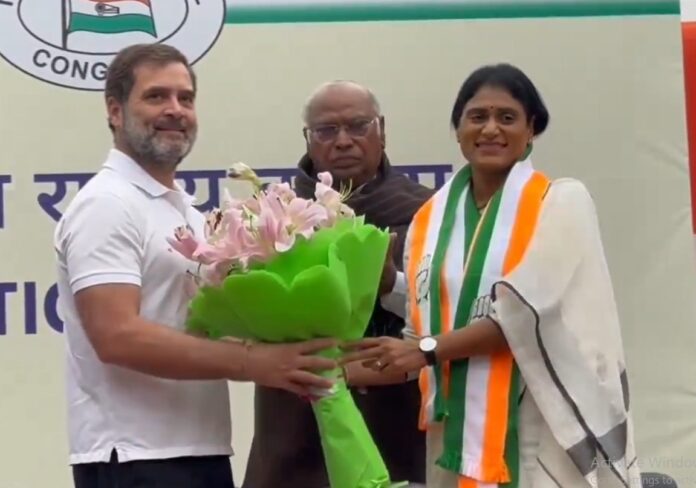 Senior leader from Andhra Pradesh YS Sharmila ji joins the INC in the presence of Congress President Shri @kharge, Shri @RahulGandhi and General Secy (Org.) Shri @kcvenugopalmp at the AICC HQ in New Delhi. pic.twitter.com/LqMvqqqwCm